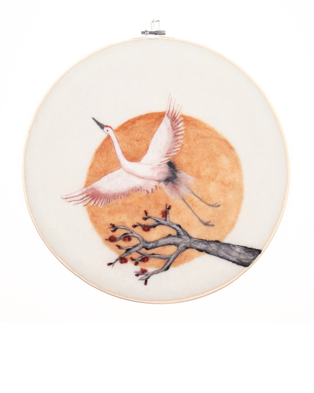 Deze muurdecoartie is met de hand genaaldvilt op een wollen stof met merinowol. Het geheel zit in een borduurring gespannen. De achterkant is netjes afgewerkt met hout.